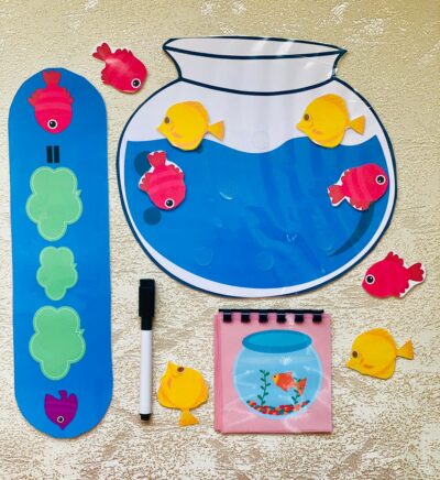 Fish jar board, reusable stickers, mini question diary, dry-erase math card, and a free marker!